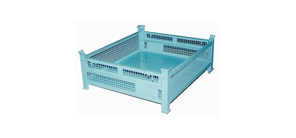 Caixa alimentadora empilhável para peças leves baixa, estrutura em cantoneira, abas laterais bipartidas basculantes teladas,assoalho em chapa # 10 e fechamento em chapa # 14 ou tela malha 25×25.